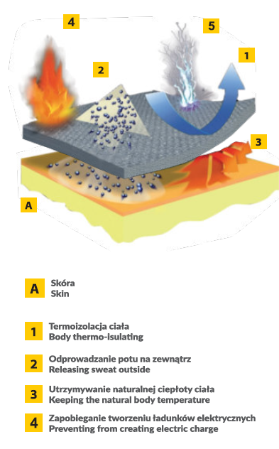 Jak każda dobra bielizna termoaktywna - posiada właściwości termoregulacyjne, dzięki czemu chroni organizm przed przegrzaniem i zimnem.